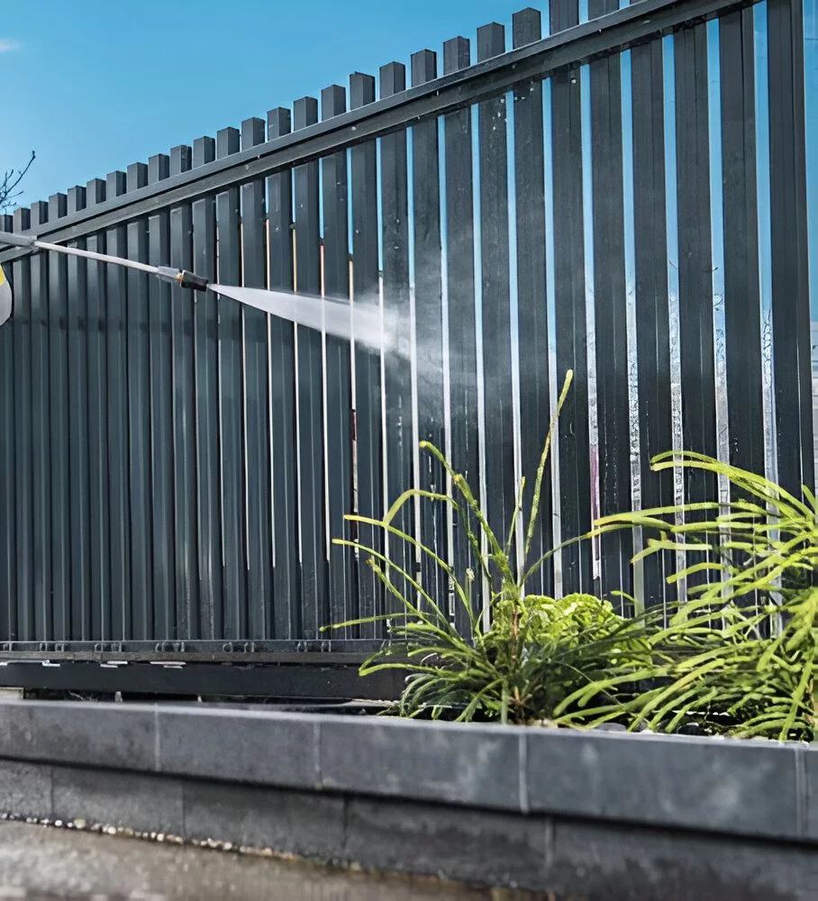 For metal gates and fencing, we use controlled cleaning methods to prevent corrosion and finish degradation.